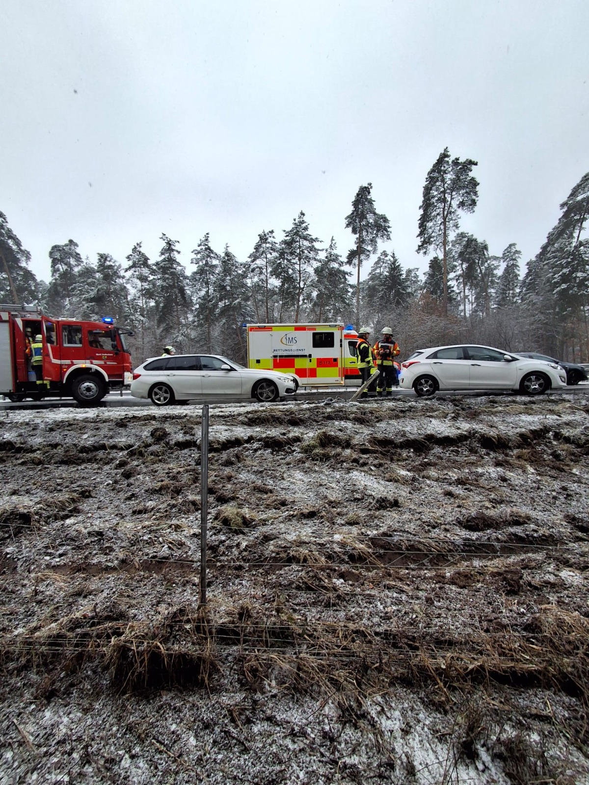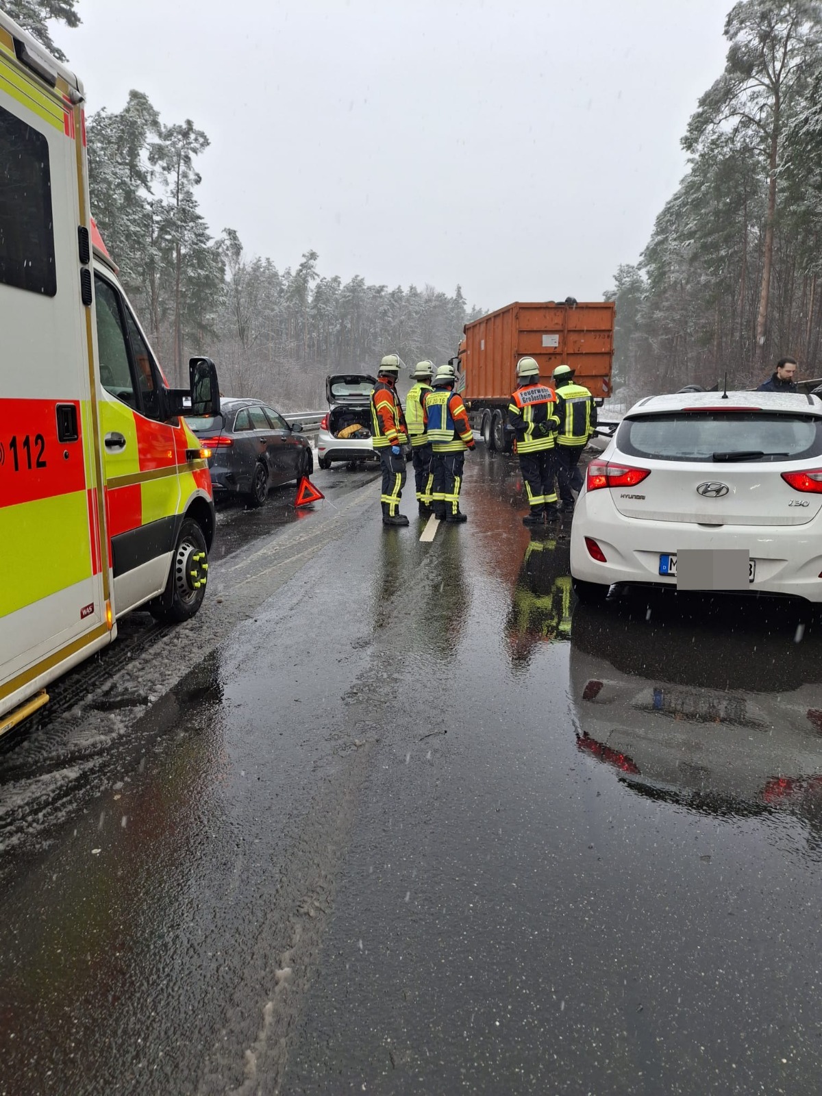 Kurz vor der Anschlussstelle Großostheim-Nord/B26 war ein PKW auf dem linken Fahrstreifen aufgrund winterlicher Straßenverhältnisse ins Schleudern geraten. Der PKW kollidierte dabei mit einem auf dem rechten Fahrstreifen fahrenden Lastzug, der durch den Anstoß nach rechts von der Fahrbahn abkam. Der LKW-Fahrer konnte seinen Lastwagen auf die Fahrbahn zurücksteuern, sein Anhänger kippte aber auf dem Bankett um und die geladenen Reifen verteilten sich neben der Fahrbahn. Die beiden Fahrzeuglenker, die sich alleine in ihren Fahrzeugen befanden, wurden vom eingetroffenen Rettungsdienst gesichtet und versorgt. Beide Unfallbeteiligte mussten aber nicht in ein Krankenhaus abtransportiert werden. Der unfallbeteilige PKW konnte später seine Fahrt selbst fortsetzen. Beim Lastzug waren aufwändige Bergungsarbeiten notwendig. Dafür musste eine Fachfirma mit schwerem Gerät anrücken. Sowohl der Anhänger wie auch der Abrollcontainer mussten wieder aufgestellt werden, bevor sie abtransportiert werden konnten.