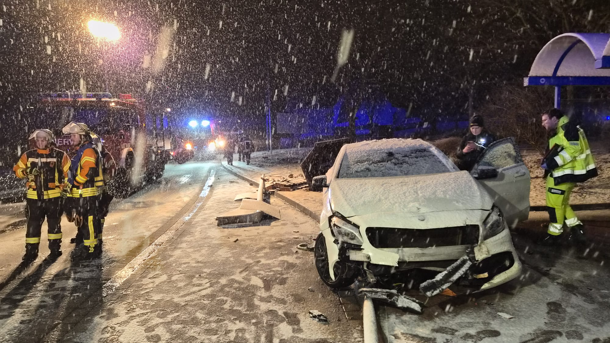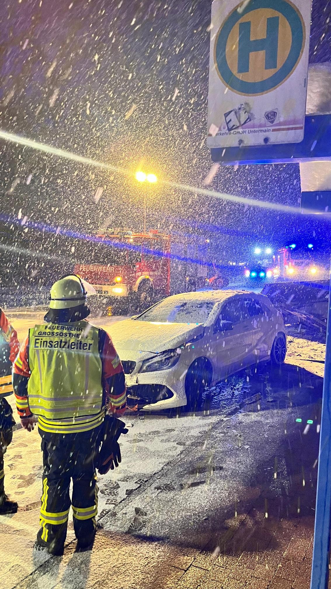 Pflaumheim. Am späten Abend des Sonntag, 15.02.2026, fuhr ein 27-jähriger Mann gegen 23:00 Uhr bei winterlichen Verhältnissen und Schneefall aus Großostheim kommend nach Pflaumheim. Der nach Polizeiangaben alkoholisierte Fahrer im Faschingskostüm bemerkte dabei eine Rechtskurve zu spät und fuhr geradewegs auf den Parkbereich zwischen der Großostheimer Straße und dem Bahnweg zu. Dabei überfuhr der Alleinbeteiligte mehrere Straßenlaternen, einen Fahnenmast und die Pflaumheimer Ortseingangstafel bis er schließlich vor dem Bushäusschen an der Haltestelle "Großostheimer Straße" auf dem Gehweg zum Stehen kam. Durch die Kollision war ein Teil von Pflaumheim für einige Zeit ohne Strom. Glücklicherweise wurden weder der Fahrer noch Außenstehende bei dem Verkehrsunfall ernsthaft verletzt. Nach einer Sichtung durch den Rettungsdienst nahm ihn eine Polizeistreife für eine Blutabnahme mit aufs Revier. Die Feuerwehr Großostheim war mit drei Fahrzeugen und 13 Einsatzkräften unter der Einsatzleitung des stellvertretenden Kommandanten Volker Becker vor Ort. Die Maßnahmen beschränkten sich auf die Sicherung des Verkehrs, die Ausleuchtung der Einsatzstelle und das Freiräumen der Fahrbahn und der Gehwege von Trümmerteilen. Der Einsatz konnte nach etwa einer Stunde an den gemeindlichen Bauhof, den Energieversorger und einen Abschleppdienst übergeben werden.