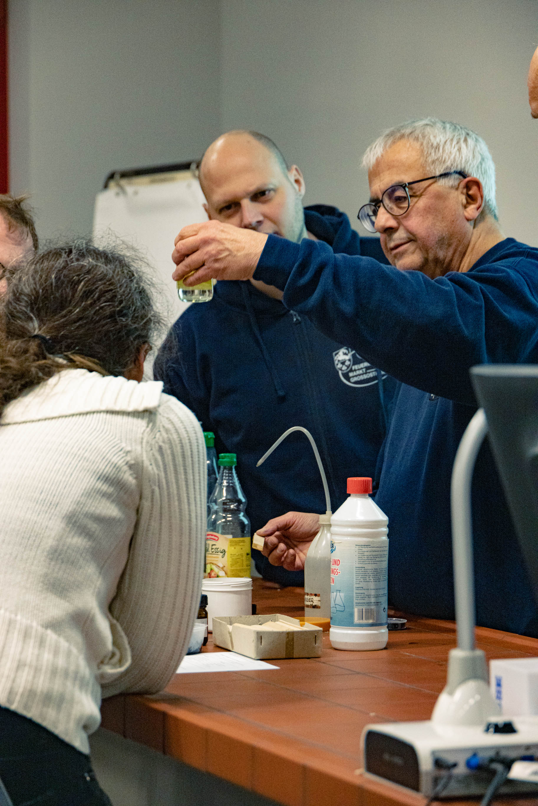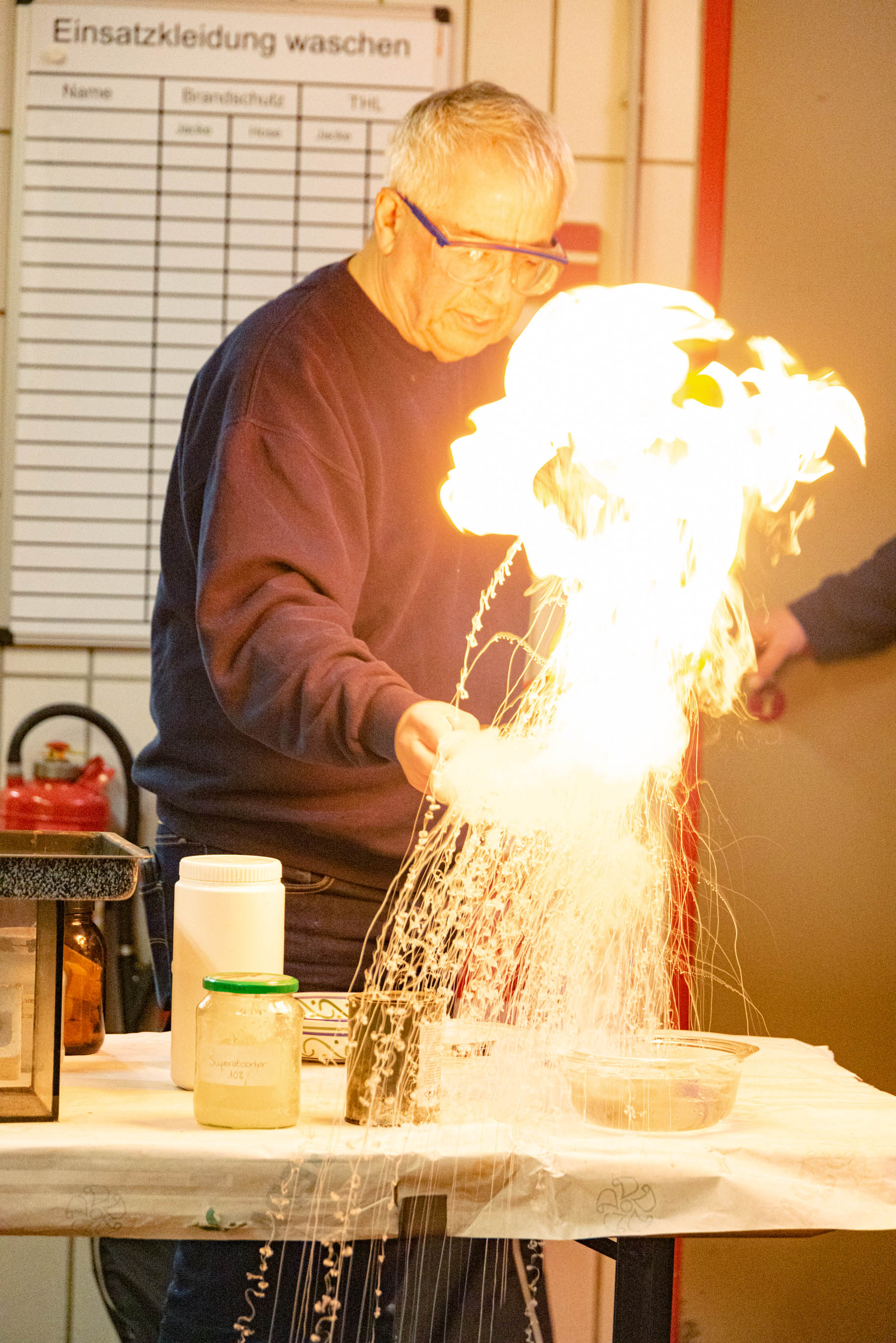 Der pensionierte Berufschemiker Wolfgang Rollmann, im Landkreis Aschaffenburg für die Feuerwehren auch als "Fachberater Chemie" im Dienst, brachte einige Beispiele mit. Selbstverständlich ist es nicht möglich, aus der Ferne und nur mit der Kenntnis von Presseberichten zuverlässige Angaben zum detaillierten Geschehen in der Schweiz zu treffen. Zum Vergleich hatte Rollmann daher einen ähnlichen Brand aus einer brasilianischen Disco im Januar 2013 herangezogen, bei dem die Untersuchungen zur Brandursache und zum Brandverlauf abgeschlossen sind. Fakt ist allemal: Hartschäume aus Polystyrol und Polyurethan - häufig genutzt zur Wärme- oder Schalldämmung - sind grundsätzlich leicht entflammbar. Sie können aber mit Zusatzstoffen gemischt werden, die es schwer entflammbar machen; sobald eine vorhandene Zündquelle also vom Material entfernt wird, erlischt es dann wieder von selbst. Eine Reihe sehr interessanter Brandversuche mit bearbeiteten und unbearbeiteten Dämmstoffen aus Polystyrol und Polyurethan (häufig auch verwendet in Formteilen, Matratzen und Möbeln) machten den gravierenden Unterschied greifbar. Was die Behandlung dieser Materialien im Detail bewirkt, kann sich durch chemische oder physikalische Reaktionen zeigen: Verkohltes Material kann sich als Schutzschicht auf dem Kunststoff ablagern und so den weiteren Abbrand verhindern. Flammschutzmittel können direkt in die Kettenreaktion der Verbrennung eingreifen und diese abbrechen. Eine weitere physikalische Eigenschaft von Brandschutzmitteln ist die Freisetzung von Wasser, das den Brand unmittelbar kühlt.