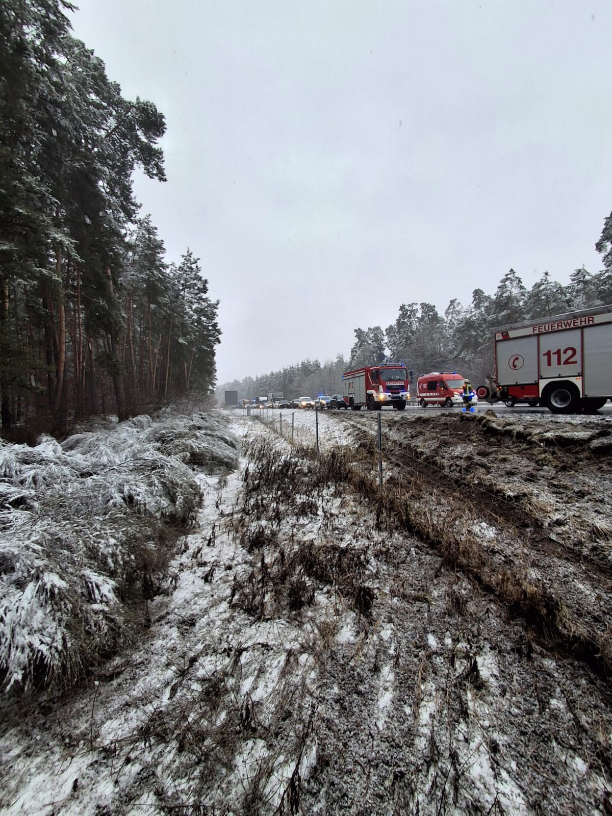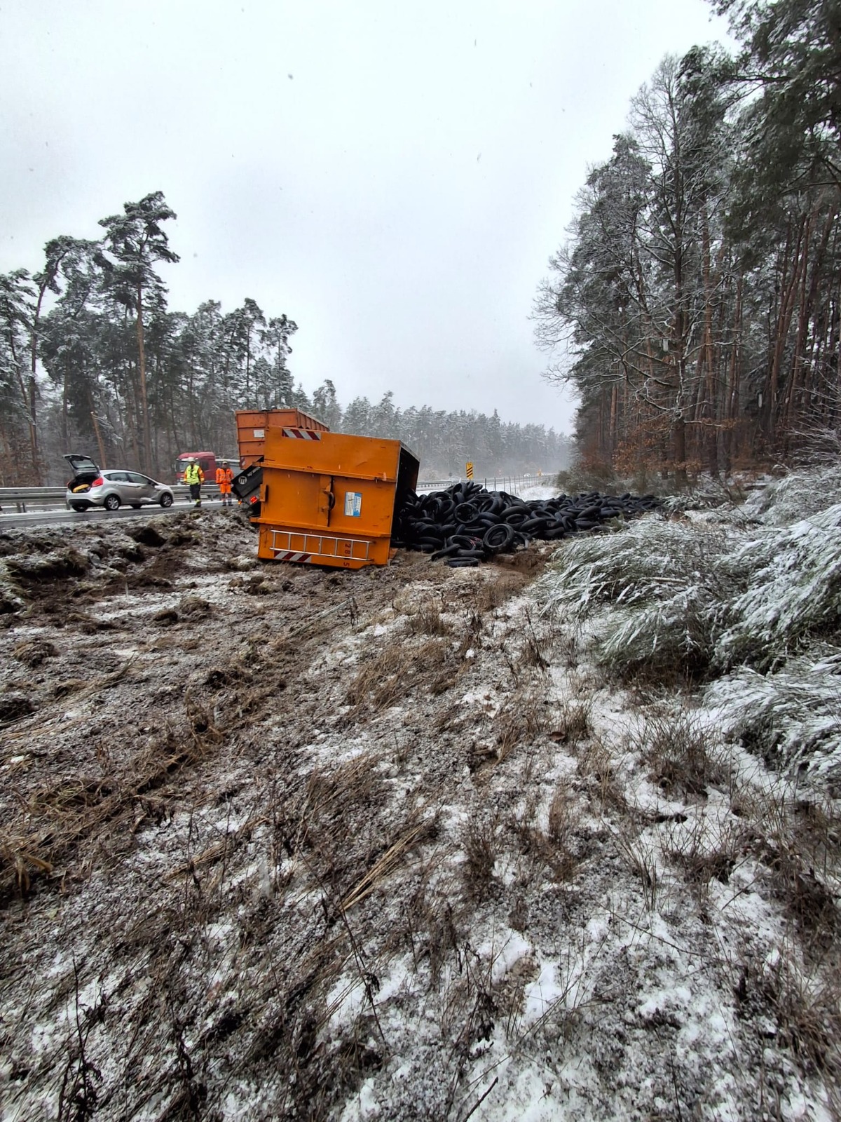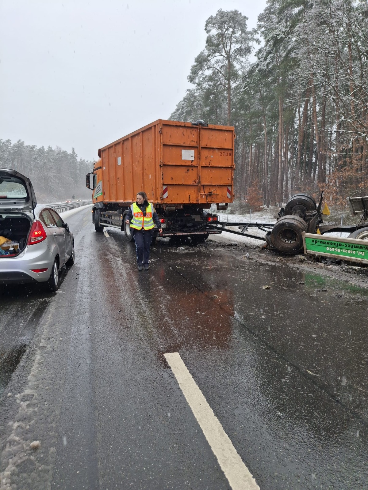 Kurz vor der Anschlussstelle Großostheim-Nord/B26 war ein PKW auf dem linken Fahrstreifen aufgrund winterlicher Straßenverhältnisse ins Schleudern geraten. Der PKW kollidierte dabei mit einem auf dem rechten Fahrstreifen fahrenden Lastzug, der durch den Anstoß nach rechts von der Fahrbahn abkam. Der LKW-Fahrer konnte seinen Lastwagen auf die Fahrbahn zurücksteuern, sein Anhänger kippte aber auf dem Bankett um und die geladenen Reifen verteilten sich neben der Fahrbahn. Die beiden Fahrzeuglenker, die sich alleine in ihren Fahrzeugen befanden, wurden vom eingetroffenen Rettungsdienst gesichtet und versorgt. Beide Unfallbeteiligte mussten aber nicht in ein Krankenhaus abtransportiert werden. Der unfallbeteilige PKW konnte später seine Fahrt selbst fortsetzen. Beim Lastzug waren aufwändige Bergungsarbeiten notwendig. Dafür musste eine Fachfirma mit schwerem Gerät anrücken. Sowohl der Anhänger wie auch der Abrollcontainer mussten wieder aufgestellt werden, bevor sie abtransportiert werden konnten.