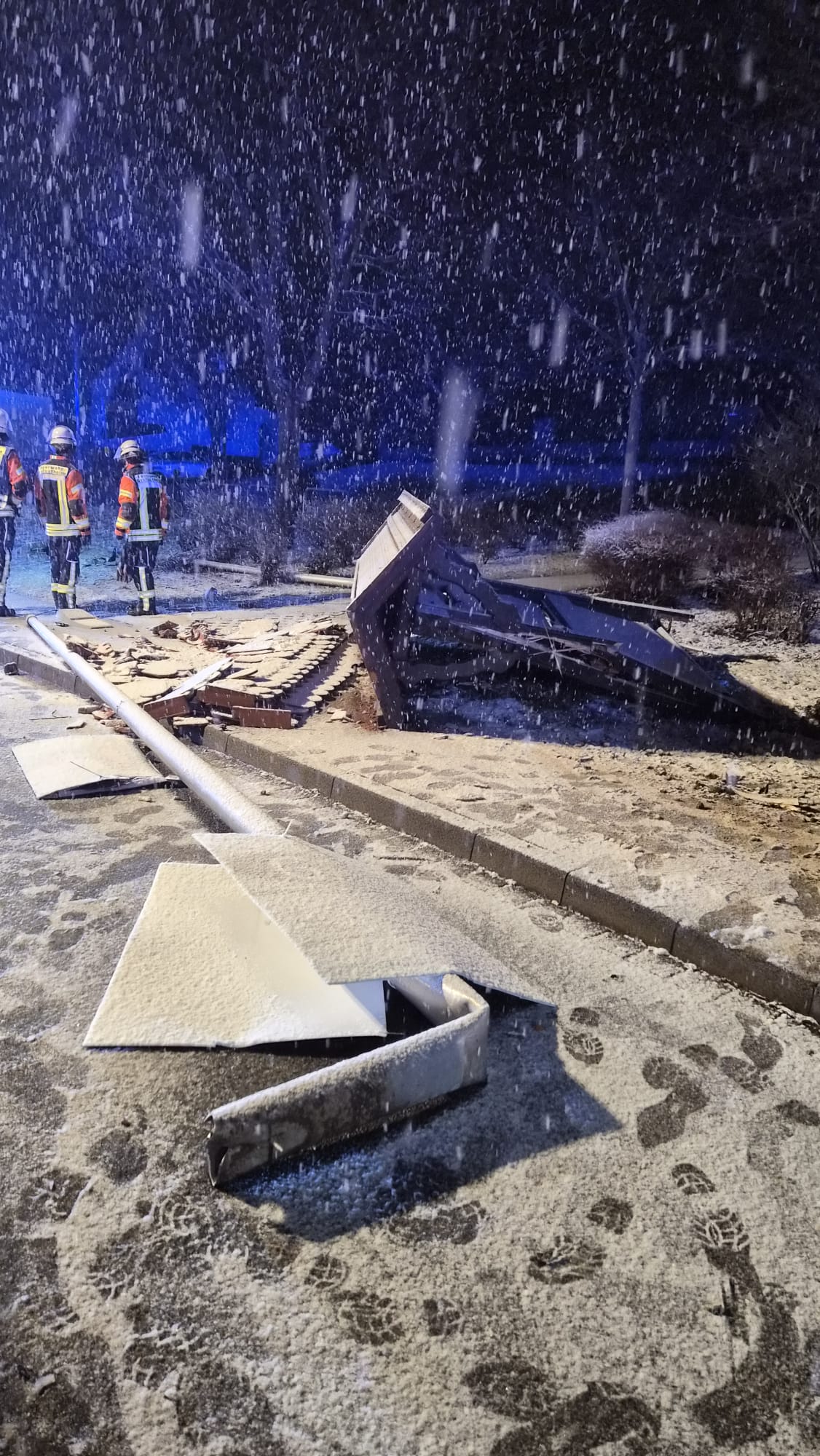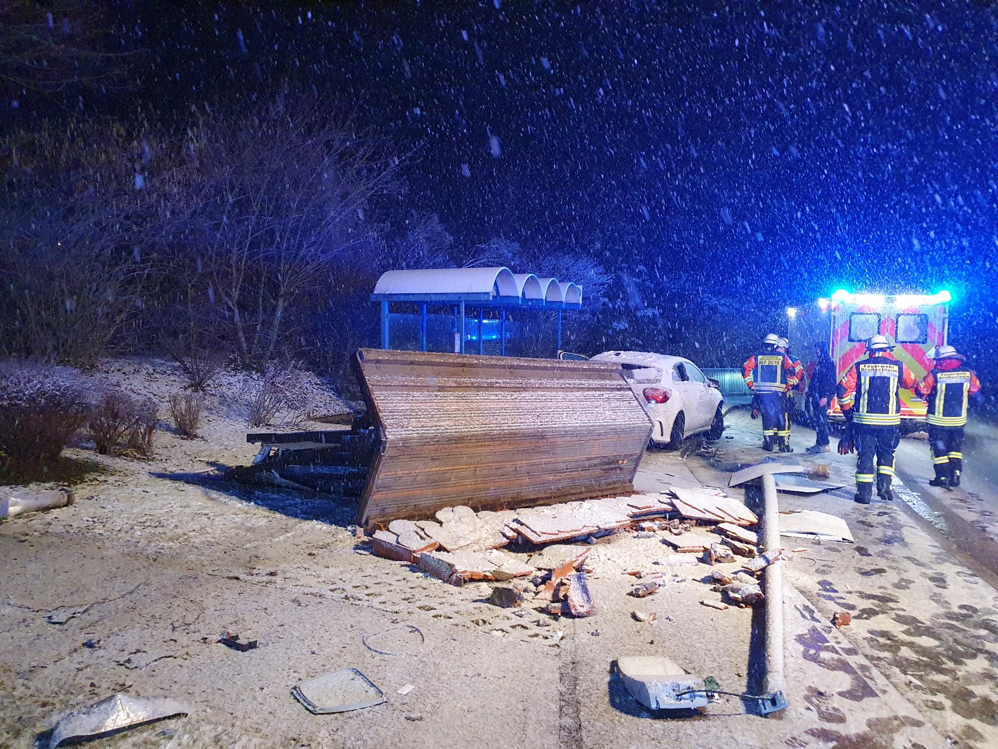 Pflaumheim. Am späten Abend des Sonntag, 15.02.2026, fuhr ein 27-jähriger Mann gegen 23:00 Uhr bei winterlichen Verhältnissen und Schneefall aus Großostheim kommend nach Pflaumheim. Der nach Polizeiangaben alkoholisierte Fahrer im Faschingskostüm bemerkte dabei eine Rechtskurve zu spät und fuhr geradewegs auf den Parkbereich zwischen der Großostheimer Straße und dem Bahnweg zu. Dabei überfuhr der Alleinbeteiligte mehrere Straßenlaternen, einen Fahnenmast und die Pflaumheimer Ortseingangstafel bis er schließlich vor dem Bushäusschen an der Haltestelle "Großostheimer Straße" auf dem Gehweg zum Stehen kam. Durch die Kollision war ein Teil von Pflaumheim für einige Zeit ohne Strom. Glücklicherweise wurden weder der Fahrer noch Außenstehende bei dem Verkehrsunfall ernsthaft verletzt. Nach einer Sichtung durch den Rettungsdienst nahm ihn eine Polizeistreife für eine Blutabnahme mit aufs Revier. Die Feuerwehr Großostheim war mit drei Fahrzeugen und 13 Einsatzkräften unter der Einsatzleitung des stellvertretenden Kommandanten Volker Becker vor Ort. Die Maßnahmen beschränkten sich auf die Sicherung des Verkehrs, die Ausleuchtung der Einsatzstelle und das Freiräumen der Fahrbahn und der Gehwege von Trümmerteilen. Der Einsatz konnte nach etwa einer Stunde an den gemeindlichen Bauhof, den Energieversorger und einen Abschleppdienst übergeben werden.